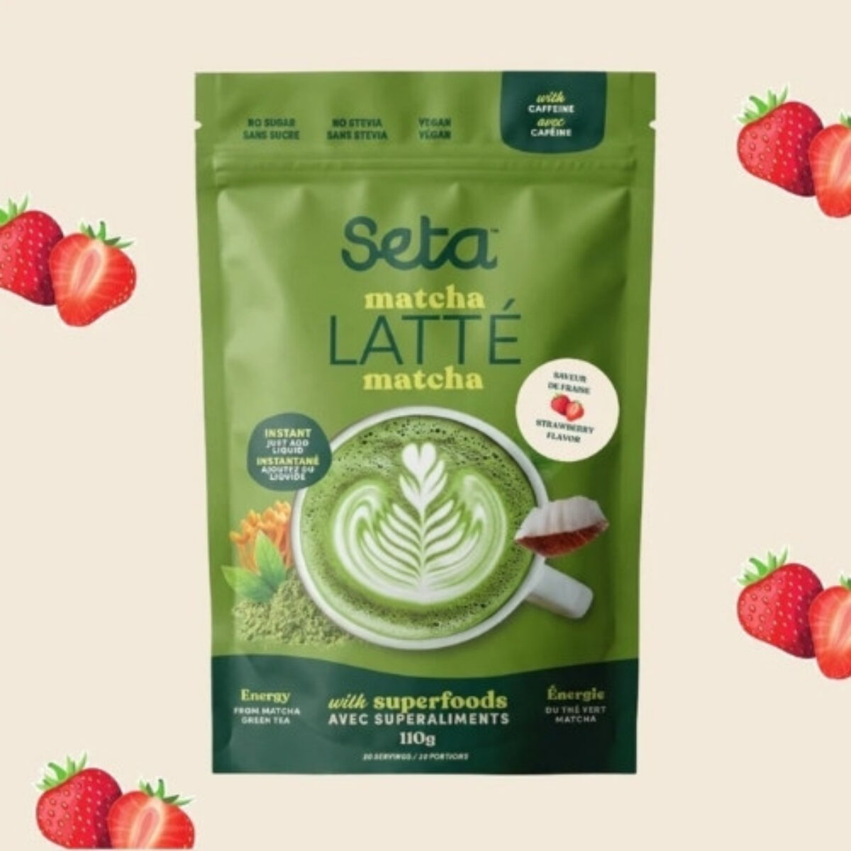Notre Latté au Matcha à saveur de fraise est idéal pour remplacer ton café matinal ou augmenter ton niveau d’énergie en après-midi ! Un mélange de 5 superaliments en parfaite harmonie pour créer un breuvage aux propriétés énergisantes et qui favorise la concentration. Gout riche et velouté du matcha avec un léger soupçon de fraise.
