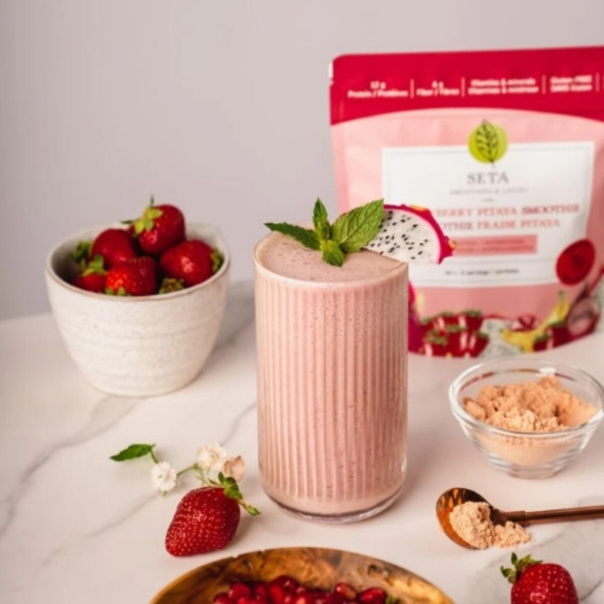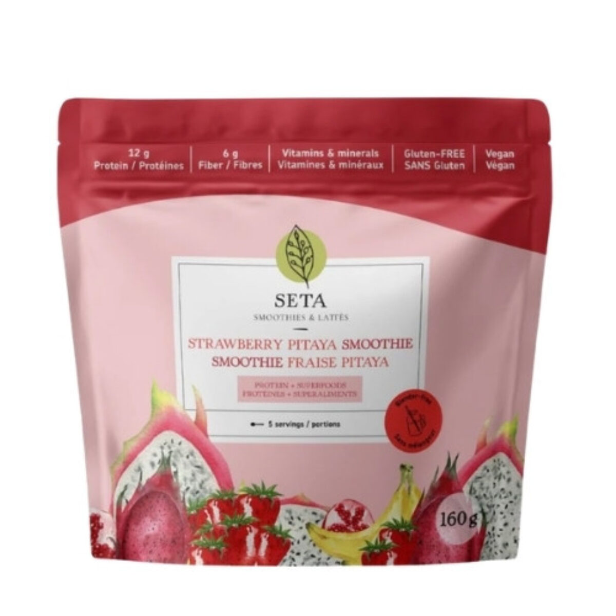 Mélange à smoothie protéiné parfait pour intégrer à ta routine matinale ou pour combler sainement tes cravings d’après-midi. Ce smoothie aux couleurs rosées te fera retomber en amour grâce à ses notes de fraises mûres, de bananes et de fruit du dragon (pitaya). Parfait pour te sentir aussi bien à l’intérieur qu’à l’extérieur ! Pour une dose de vitamine C et d’amour, c’est par ici. – 12g protéines 6g fibre/smoothie – 5 vitamines & minéraux – Fait de vrais fruits, texture onctueuse – Sans stevia