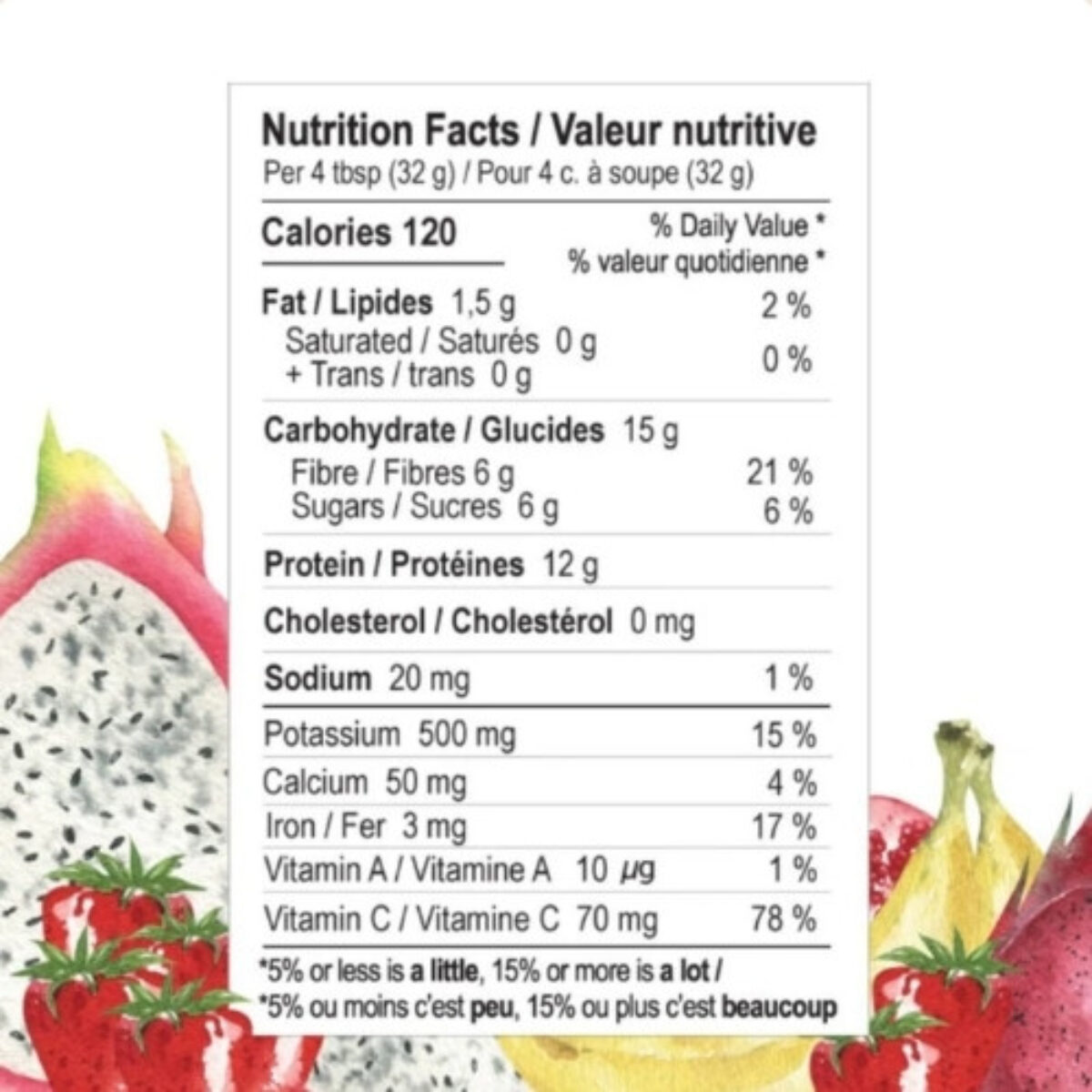 Mélange de protéines (Protéine de pois chiche, Protéine de graine de citrouille biologique) – Fraise biologique – Fibre d’acacia biologique – Banane biologique – Inuline d’agave biologique – Pitaya biologique – Grenade biologique – Baie d’acérola biologique