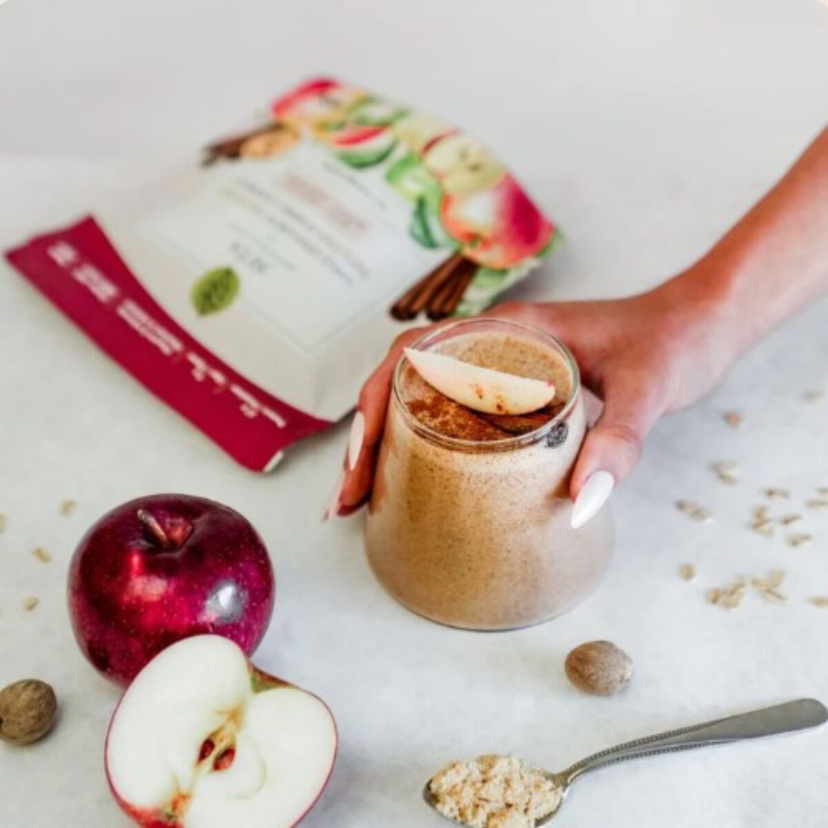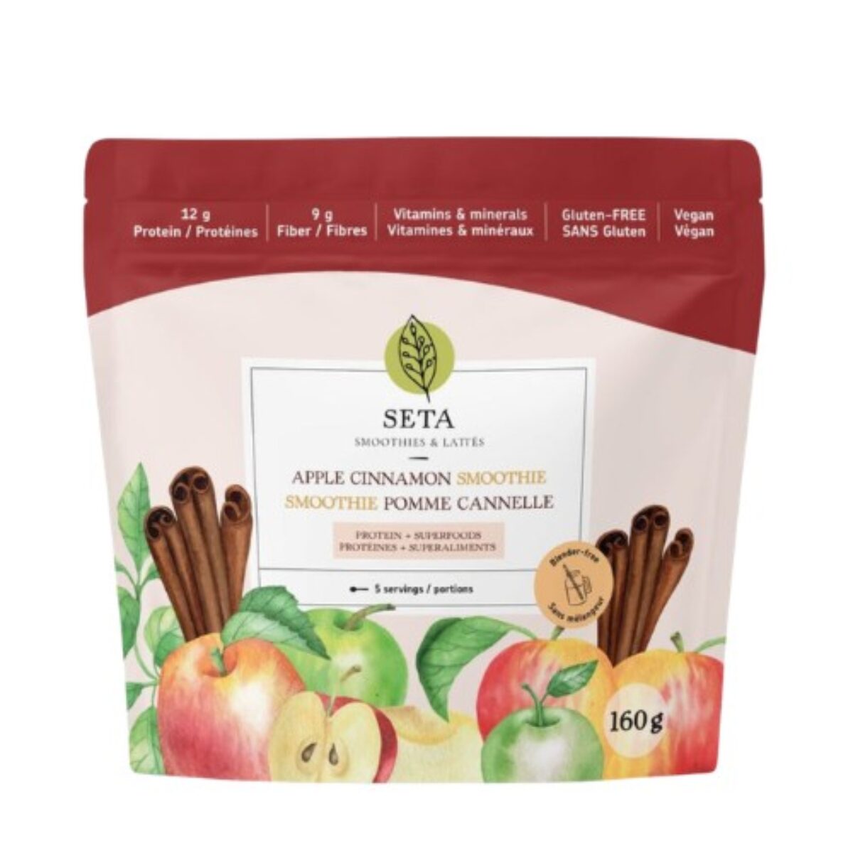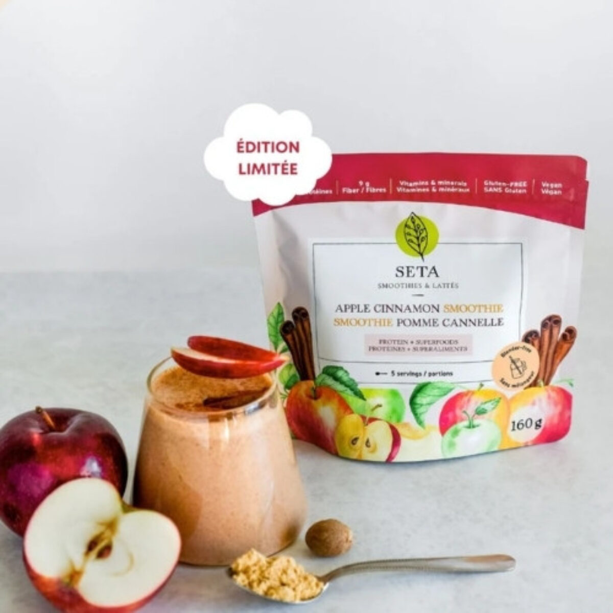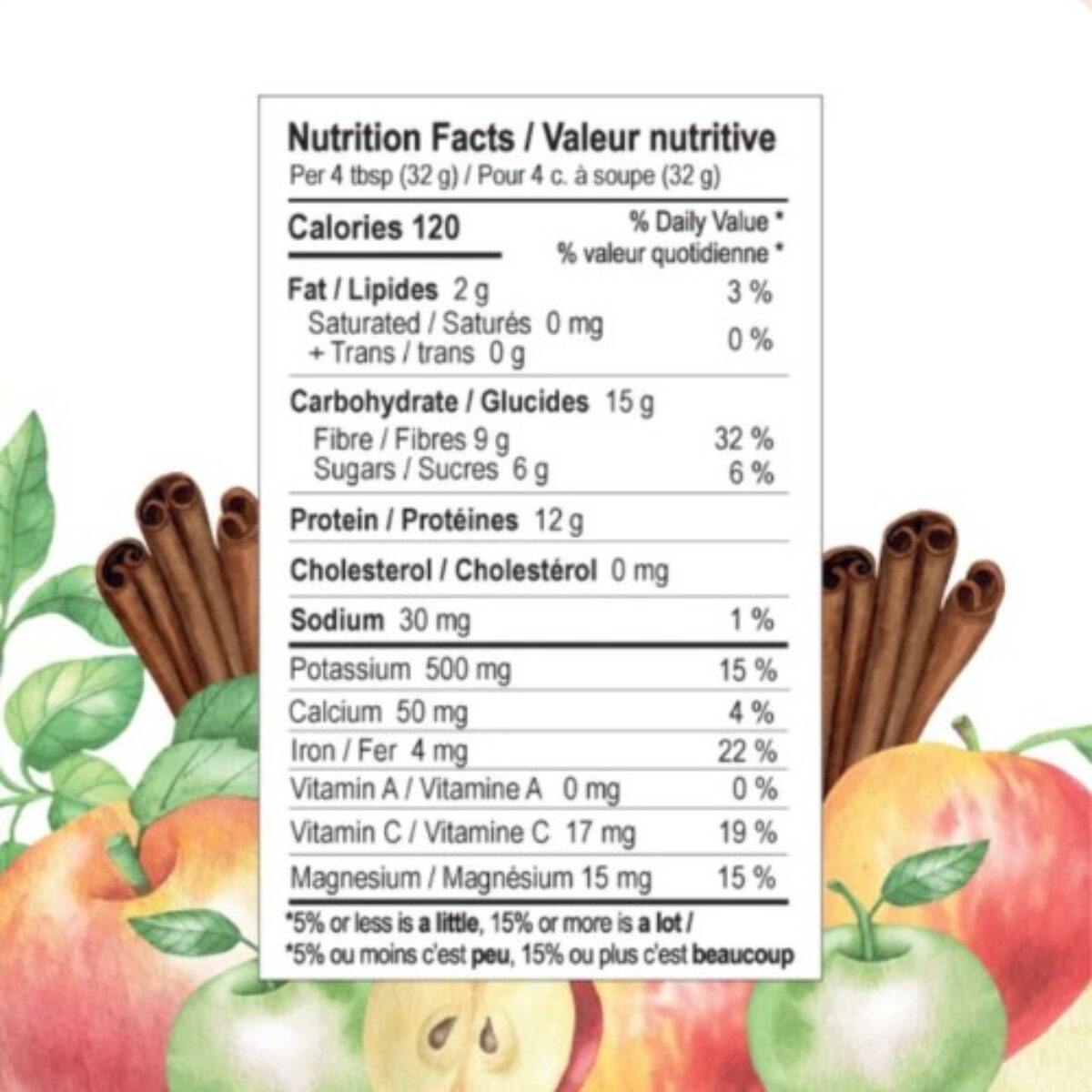 Mélange de protéines (Protéine de pois chiche, Protéine de graine de citrouille biologique) – Pomme biologique du Québec – Mélange de fibres (Fibre d’acacia biologique, Inuline d’agave biologique, enveloppes de Psyllium biologique) – Banane biologique – Cannelle biologique – Lucuma biologique – Camu Camu biologique – Noix de muscade biologique