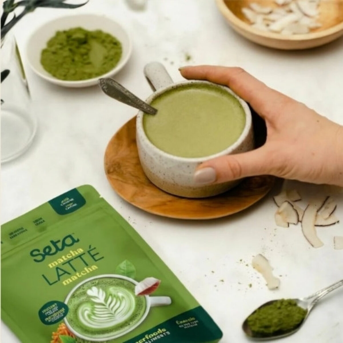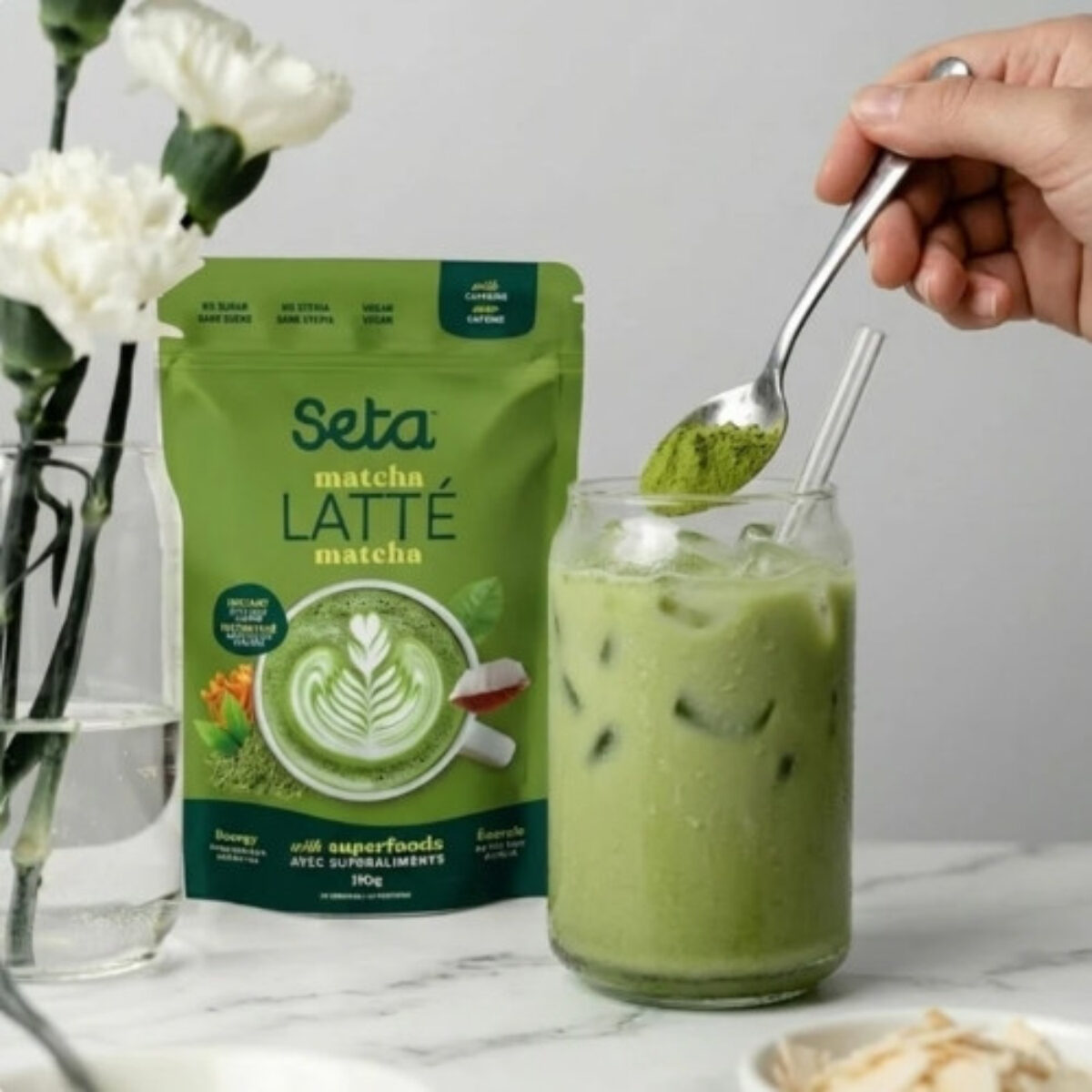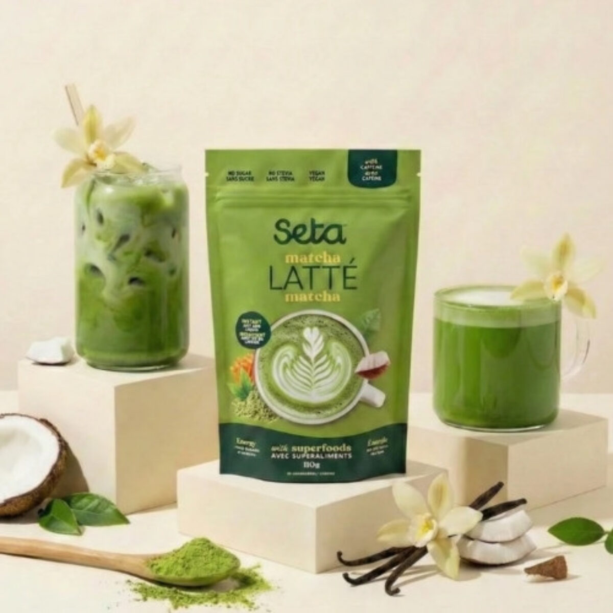 Matcha japonais biologique de cérémonie (Shizuoka- Japon) – Lait de coco biologique – Arômes naturels biologique – Huile de noix de coco TCM – Vanille biologique de Madagascar – Champignon Cordyceps – Moringa biologique – biologique
