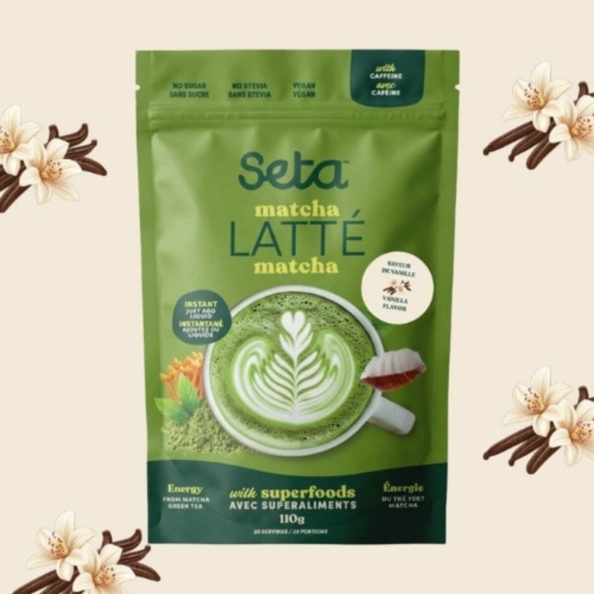 Caféine naturelle du thé vert. Notre Latté au Matcha à saveur de vanille est idéal pour remplacer ton café matinal ou augmenter ton niveau d’énergie en après-midi ! Un mélange de 5 superaliments en parfaite harmonie pour créer un breuvage aux propriétés énergisantes et qui favorise la concentration. Gout riche et velouté du matcha avec un léger soupçon de vanille 20 Portions